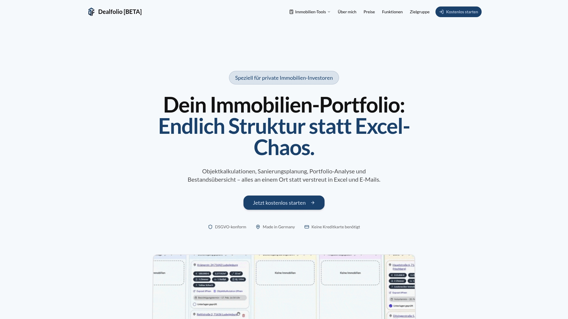 | Dealfolio | Portfolio-Management mit Funktionen wie Objektkalkulation, Sanierungsrechner und Cashflow-Prognosen | Zentralisierte Plattform, mobile Nutzung, DSGVO-konform | Keine Details zu Preisen nach der Beta-Phase | Private Buy-and-Hold-Investoren mit 1-15 Objekten |